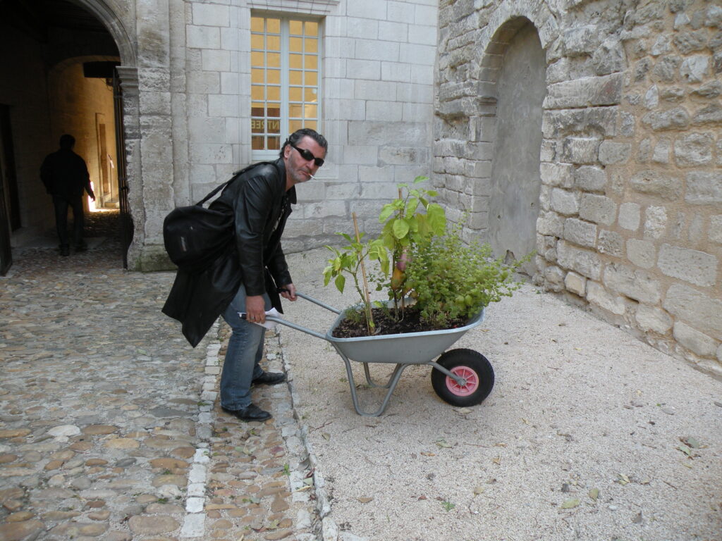 Lors de mon arrivée ce 4 octobre 2008 à La Chartreuse, je vis donc ces audacieuses (pour le moins…) brouettes à vocation (on imagine) décorative, alors forcément, je ne pouvais pas faire autrement que de les photographier… Je fis même poser l’ami écrivain (par ailleurs très talentueux) de romans noirs et de polars, Thierry Crifo…