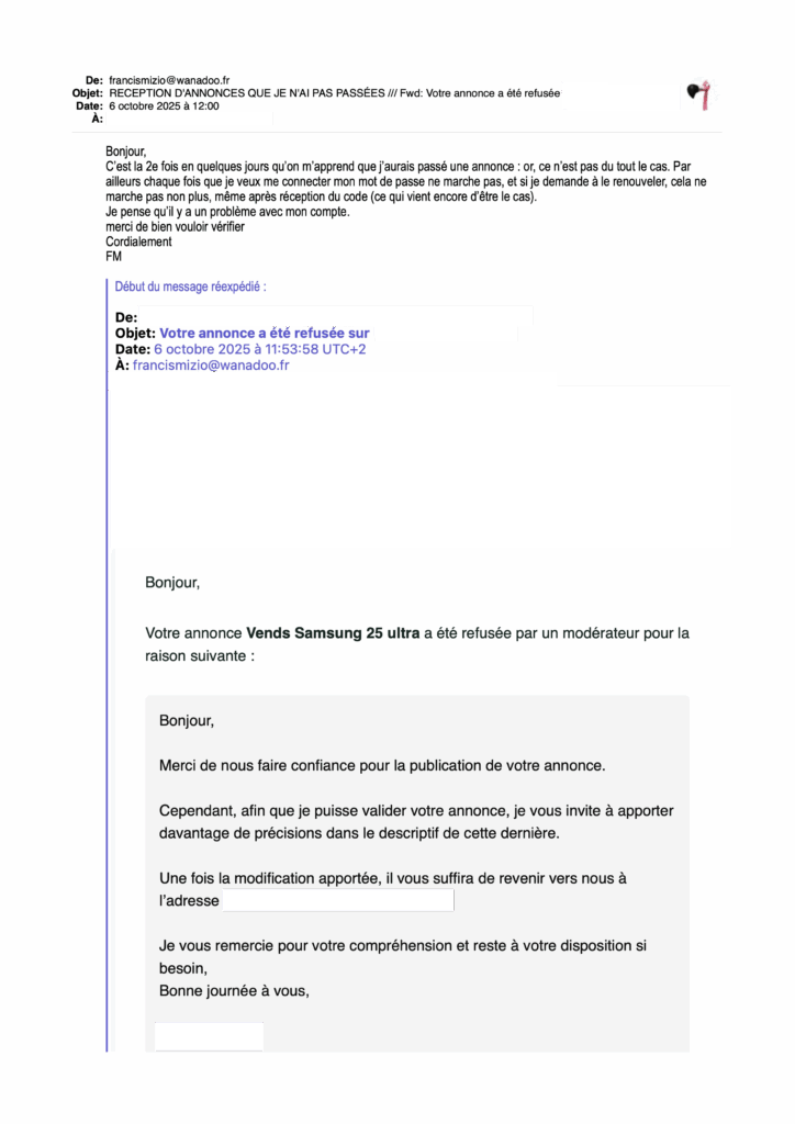 Mais ce lundi 6 octobre matin, alors je travaillais sur mon ordinateur de maison, voici que je reçois de nouveau la même alerte me disant encore que, en tant que Catherine, je viens de passer une annonce pour vendre de nouveau un Samsung. Quelques minutes après, de nouveau un mail des modérateurs me dit que l’annonce est annulée. Je me dis, puisque c’est la 2e fois, qu’ils ont un problème, alors je leur écris. Je vous mets ci-dessous les copies de mes envois, car les mails originaux du site (sauf un) ont tous disparu de mon mail ordi, les récents comme les nouveaux. Lisez ces captures donc depuis le bas de chaque capture.