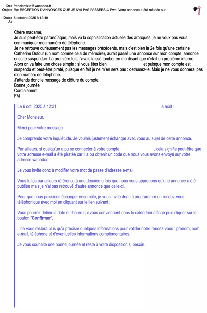 Je les rappelle. Là, une cadre Head of Customer Support, me confirme que mon compte est bien détruit, et m’assure que depuis le début, c’était bien à eux à qui j’avais affaire, que l’interlocutrice est bien de chez eux. Elle me dit aussi que s’ils ont bien tous les mails échangés dans la journée, l’annonce fallacieuse du jour, et ma venue récente, ils ne retrouvent pas la première annonce fallacieuse celle d’il y a une semaine. Elle me dit que mon code de boîte mail Orange a dû être piraté.