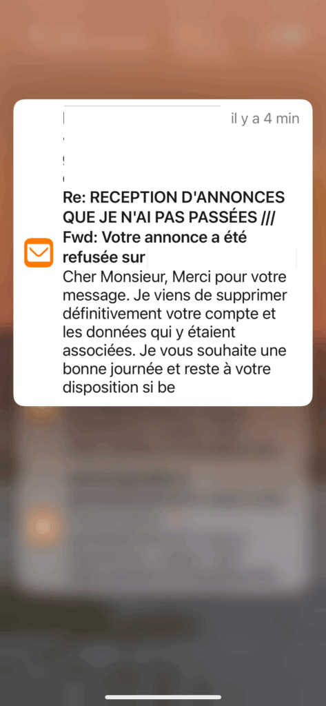 Puis une heure environ passe. Je reçois une notification de mail sur mon téléphone, m’annonçant la clôture de mon compte. J’ai le bon réflexe d’en faire une capture d’écran :