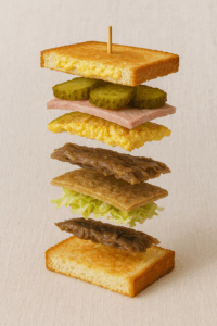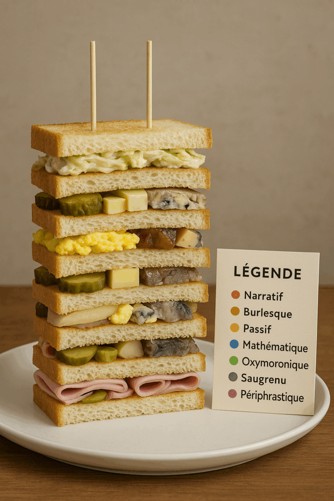 • S+7 gustatif : remplacez chaque élément par le 7ᵉ voisin de sa “famille” : jambon → rostello de dinde, cornichon → oignon pickles, comté → salers, etc. (on s’autorise la créativité, mais on garde la structure en 7).