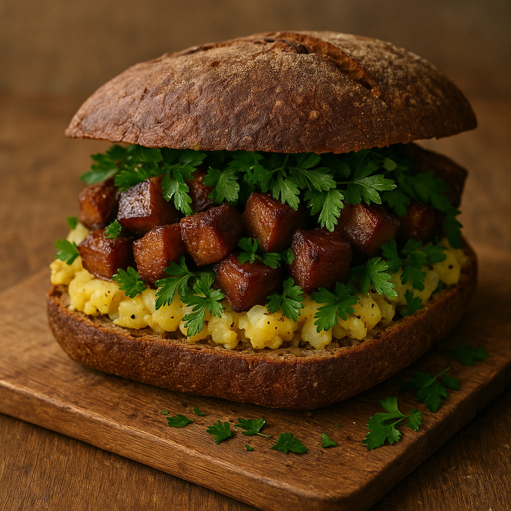 Le sandwich George Sand (période romans champêtres tel La Mare au diable et autres Petite Fadette) n’est pas une contrepèterie boîteuse cachée (cf : Riche à millions), car son esprit esprit « Miche et rillons » ressortit bien d’un rustique berrichon, qui vous campe dans les sabots et dont la robe retroussée est toute en sous entendus : le gras (dont on sait que « c’est la vie ») chante, la patate terrienne rassure, mais le persil échauffe. Ça tient au corps ; c’est large, généreux, sans afféterie. C’est un sandwich qui ne demande pas pardon d’être nourrissant.