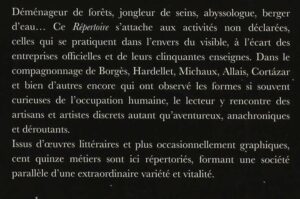 Parmi le boulot, non pas d’écrivain, mais d’animateur d’atelier d’écriture, il y a cette obligation (plaisante) de sans cesse chercher de nouvelles idées d’écriture (en tout cas quand on essaie de faire ce job un peu différemment ; j’ai cette prétention). Dans ce cadre, il m’arrive d’acheter des choses étranges tel un recueil de petites annonces matrimoniales (et cela donne « Le projet conjugal ») comme des tas d’autres livres dont le thème permettra de torturer les participant(e)s lors de mes ateliers (j’ai du stock :-). Ma dernière acquisition, toute récente est celle-ci : un petit livre tout frais et épatant, Le répertoire des métiers imaginaires, de Rémi Leboissetier aux Éditions du Sandre.